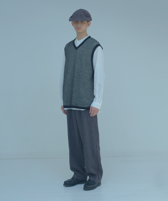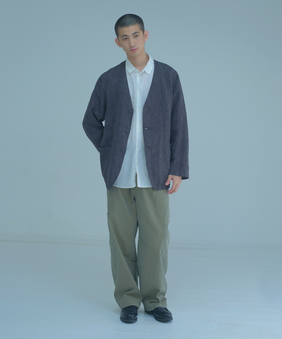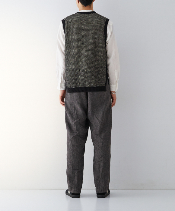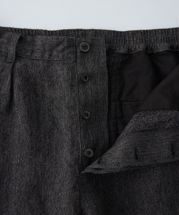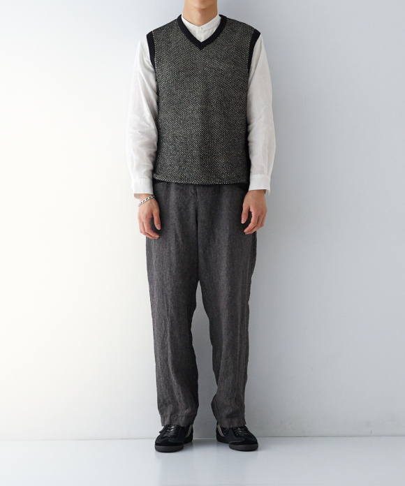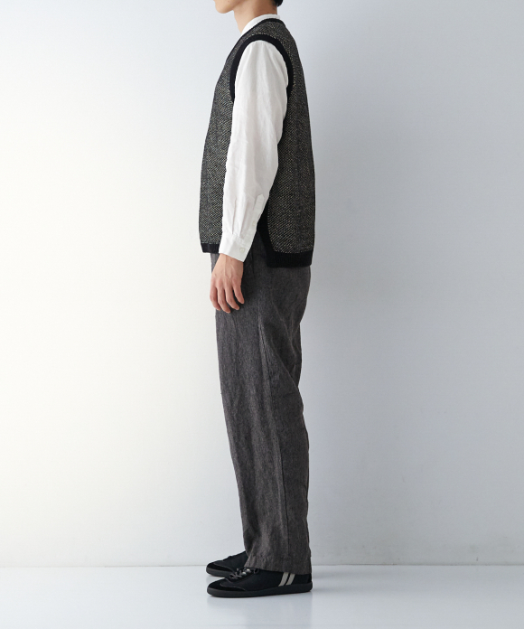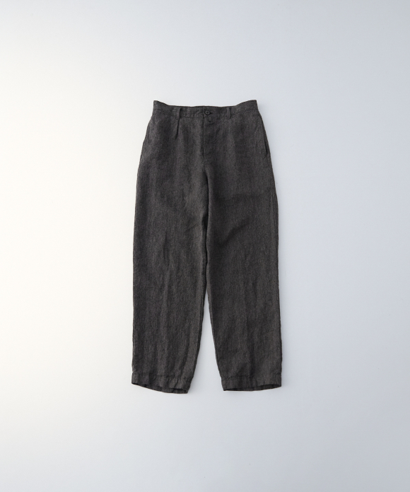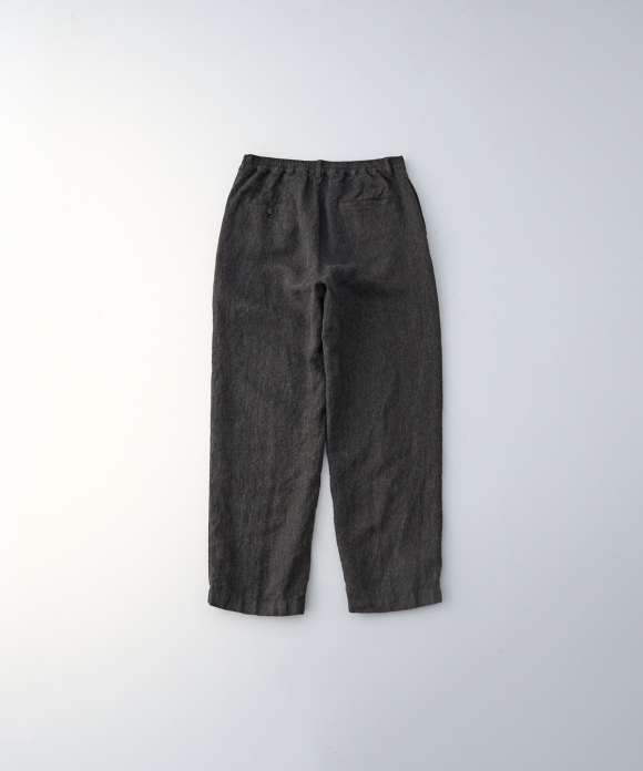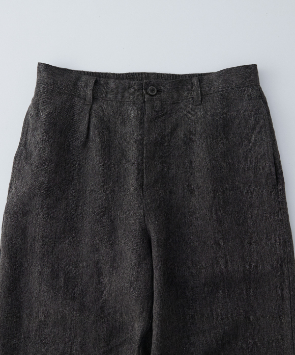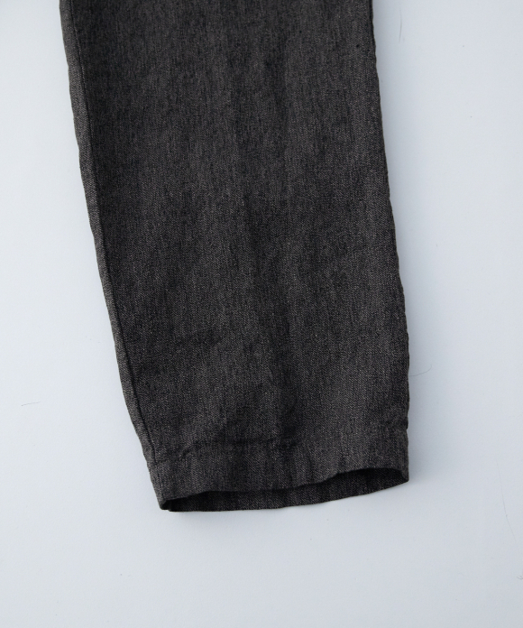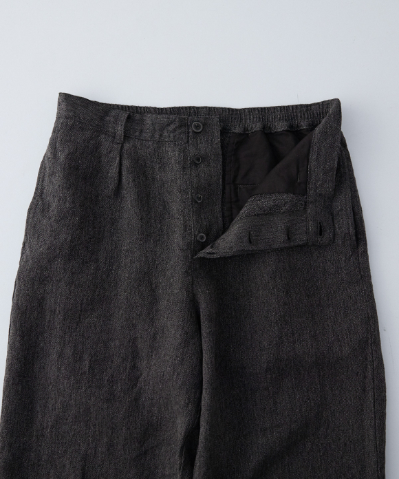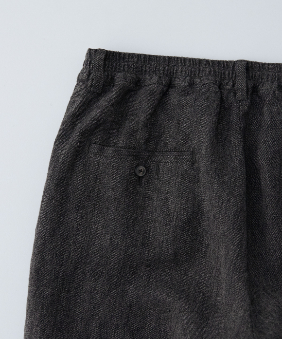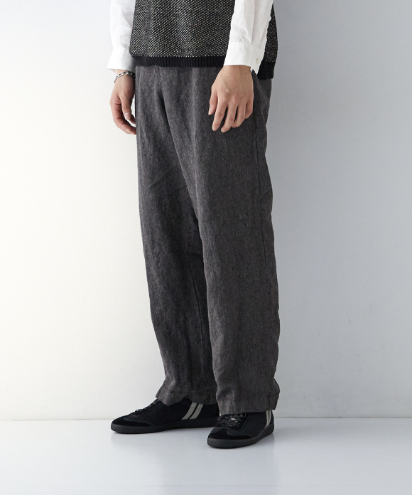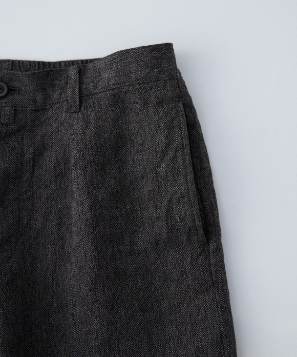 The front features slightly deep inward pleats and a loop at the center front, allowing you to secure a belt pin and prevent slippage. While the trousers have a natural crease and a simple straight silhouette, the rise is generously sized, and the elastic gathering only at the side waist ensures a beautiful fit, ease of wear, and stability. By using only side gathering, unnecessary wrinkles from excess fabric are reduced, while still providing room for movement. This results in trousers that showcase the natural wrinkles characteristic of linen.