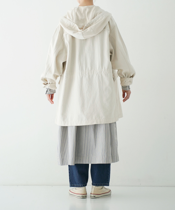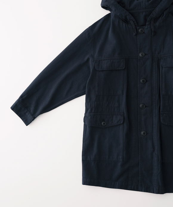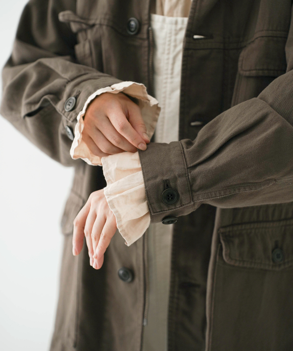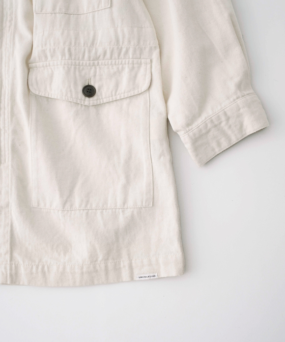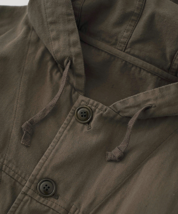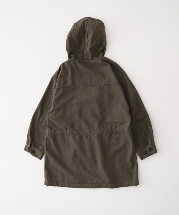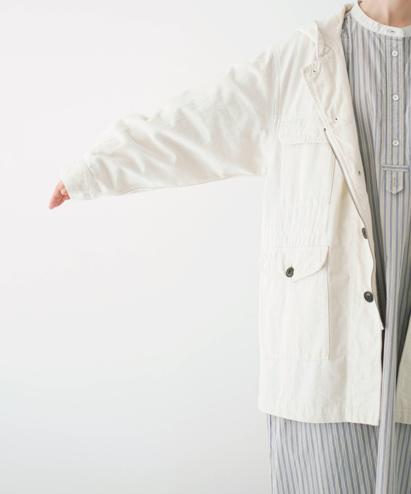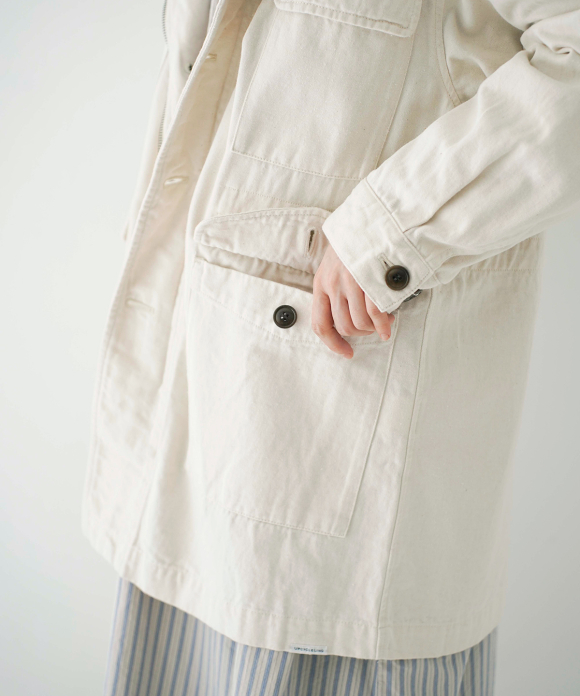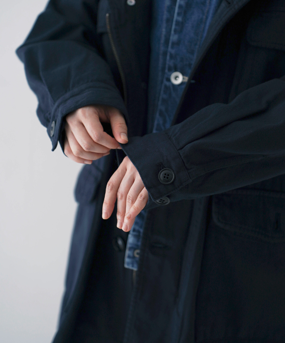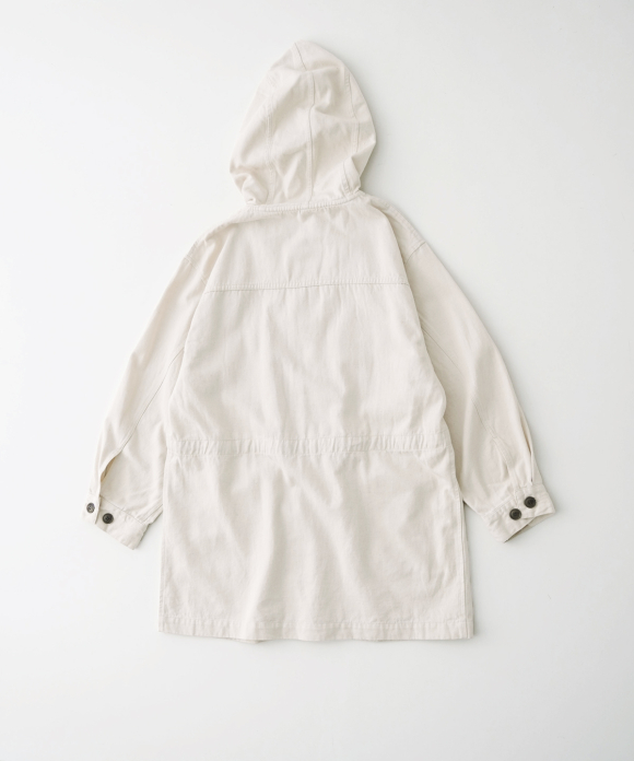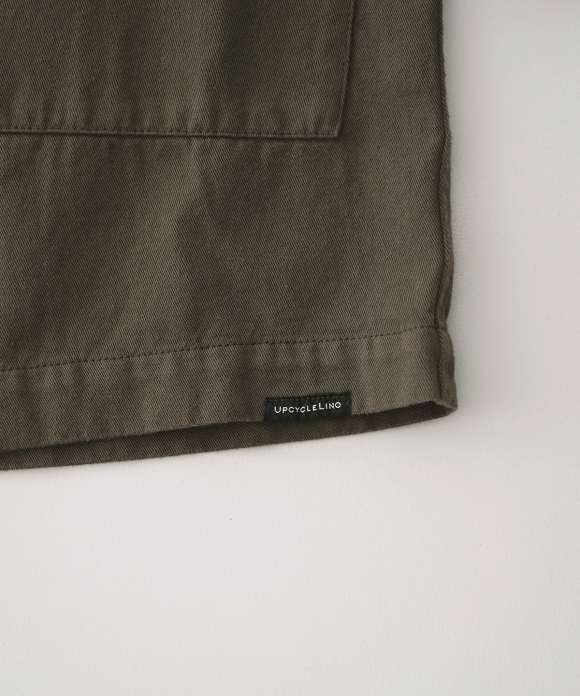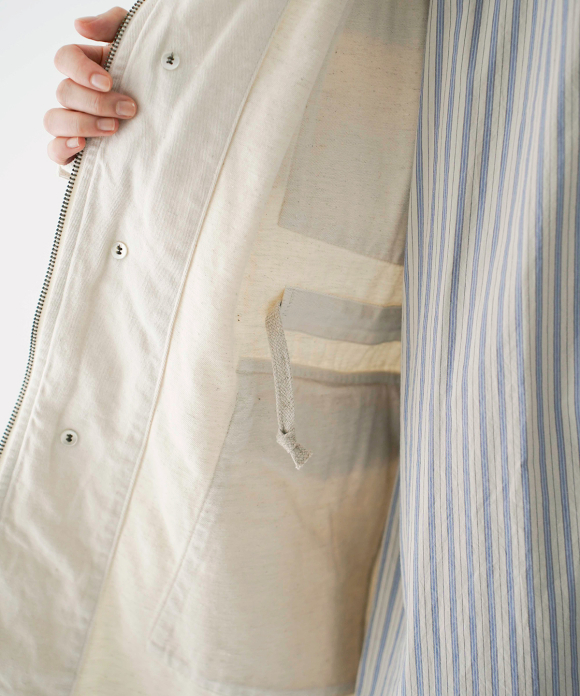A field Parka, inspired by vintage military aesthetic and crafted from our exclusive, seasonless UpcycleLino chino fabric. This piece takes its design cues from the iconic U.S. Army popularized during the 1940s and 1950s. The eco-friendly and sustainable UpcycleLino chino fabric is a unique collaboration with an established fabric house in Okayama, Japan. It is knitted from a combination of heavy weight undyed cotton warp yarn and heavy weight undyed UpcycleLino weft yarn. UpcycleLino yarn is crafted from a blend of linen fabric remnants from our garment production and virgin cotton fibers, resulting in a material that is both environmentally conscious and of superior quality.