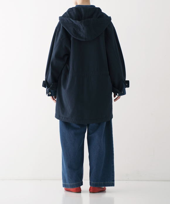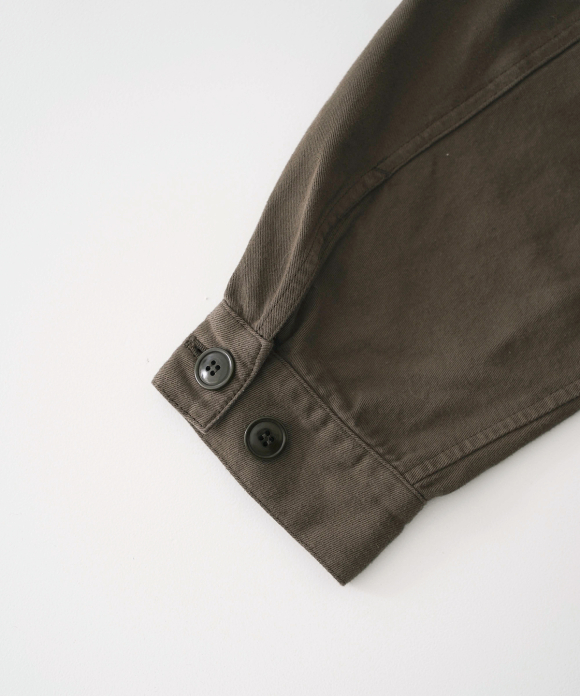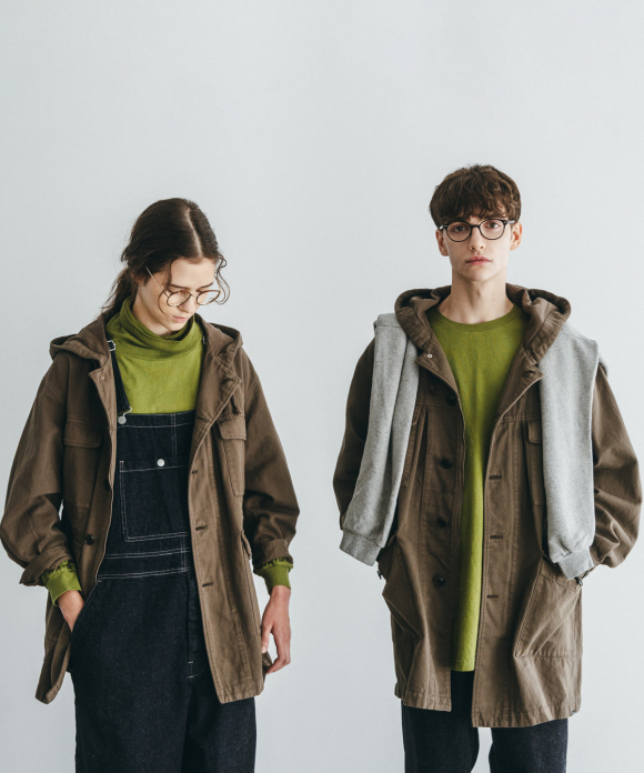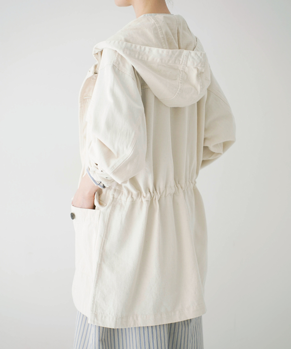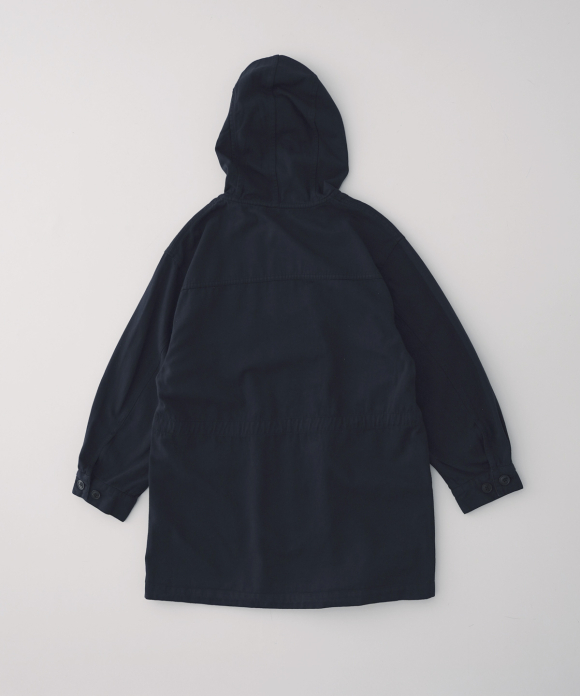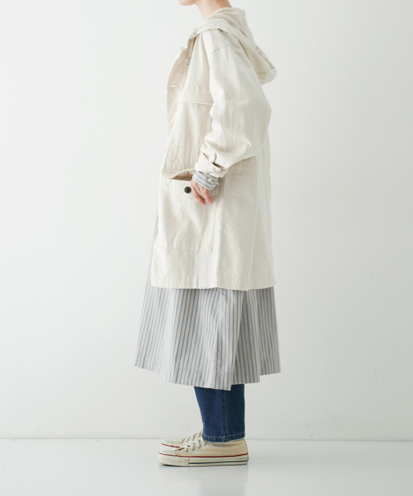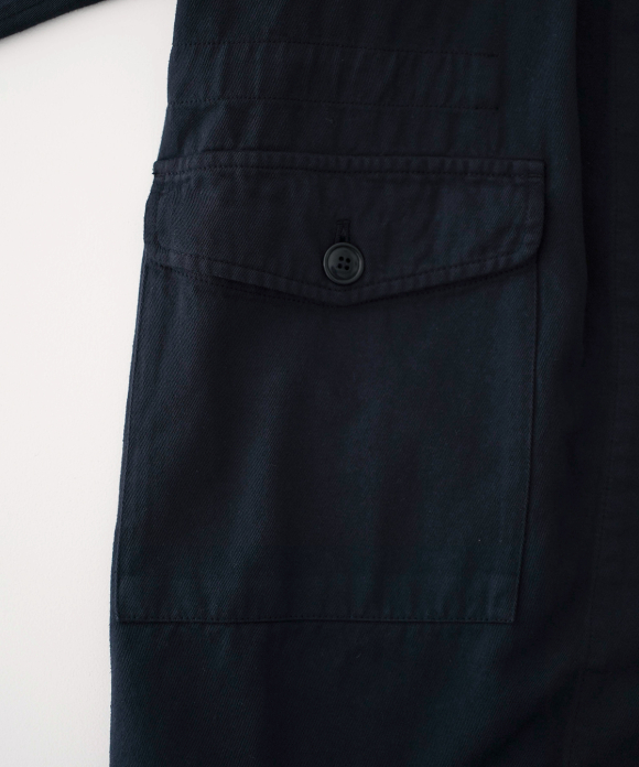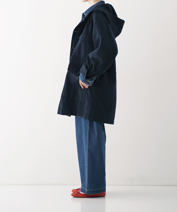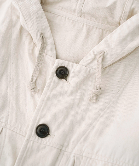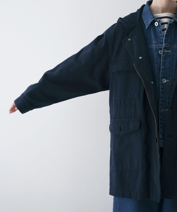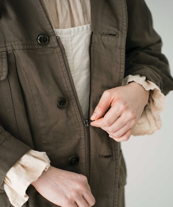 A field Parka, inspired by vintage military aesthetic and crafted from our exclusive, seasonless UpcycleLino chino fabric. This piece takes its design cues from the iconic U.S. Army popularized during the 1940s and 1950s. The eco-friendly and sustainable UpcycleLino chino fabric is a unique collaboration with an established fabric house in Okayama, Japan. It is knitted from a combination of heavy weight undyed cotton warp yarn and heavy weight undyed UpcycleLino weft yarn. UpcycleLino yarn is crafted from a blend of linen fabric remnants from our garment production and virgin cotton fibers, resulting in a material that is both environmentally conscious and of superior quality.