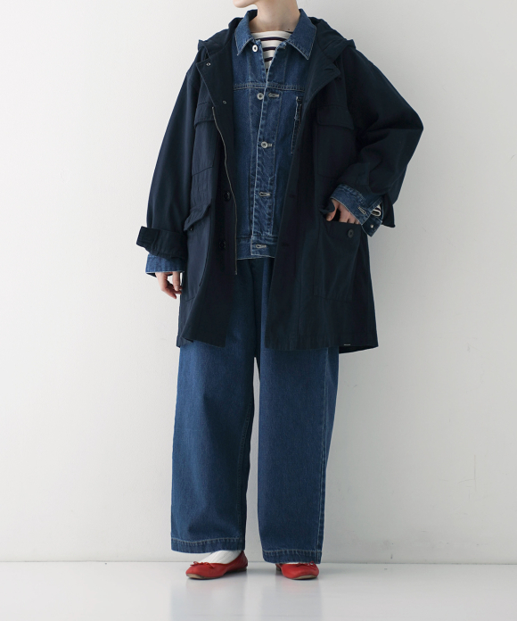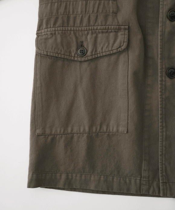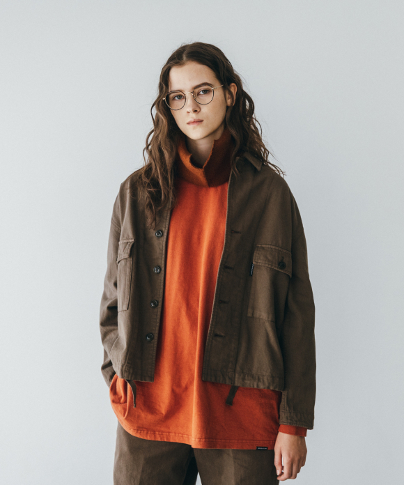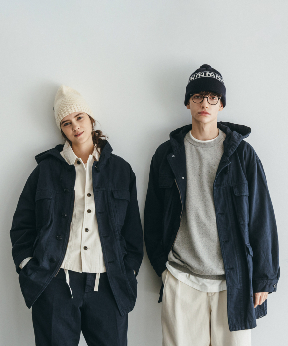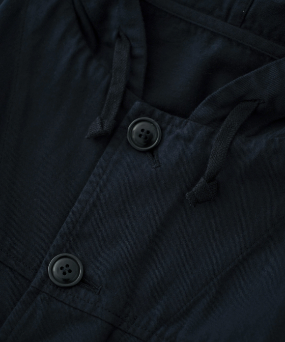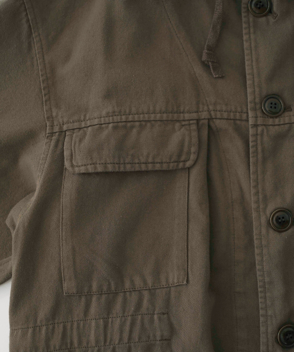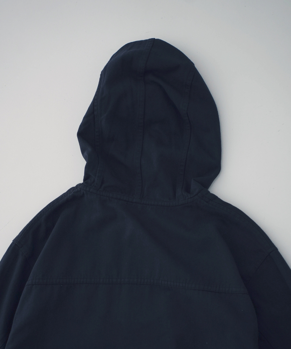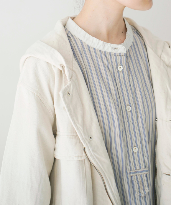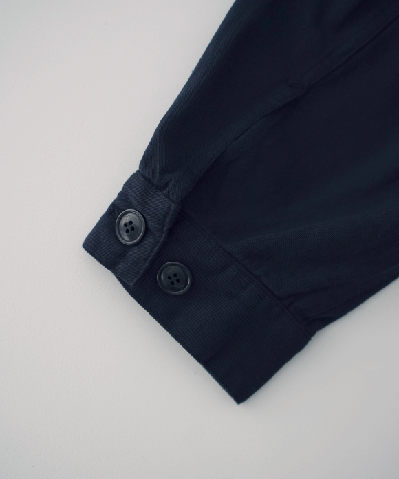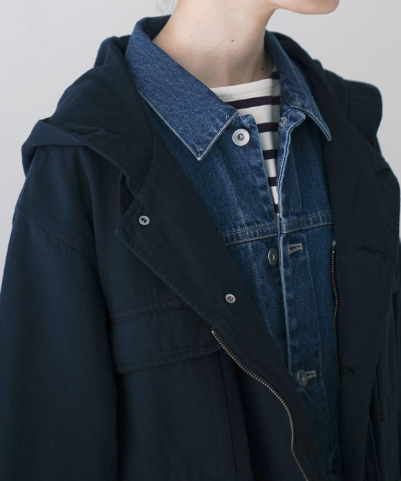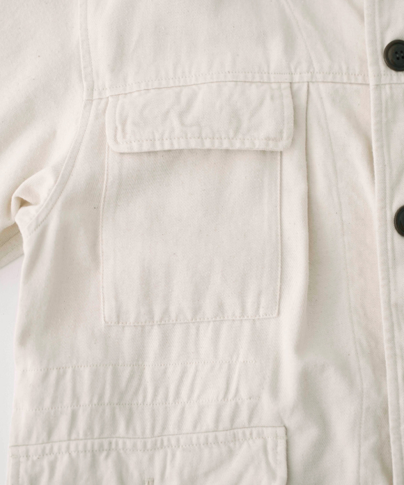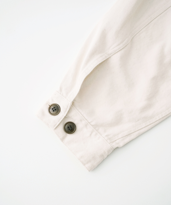 A field Parka, inspired by vintage military aesthetic and crafted from our exclusive, seasonless UpcycleLino chino fabric. This piece takes its design cues from the iconic U.S. Army popularized during the 1940s and 1950s. The eco-friendly and sustainable UpcycleLino chino fabric is a unique collaboration with an established fabric house in Okayama, Japan. It is knitted from a combination of heavy weight undyed cotton warp yarn and heavy weight undyed UpcycleLino weft yarn. UpcycleLino yarn is crafted from a blend of linen fabric remnants from our garment production and virgin cotton fibers, resulting in a material that is both environmentally conscious and of superior quality.