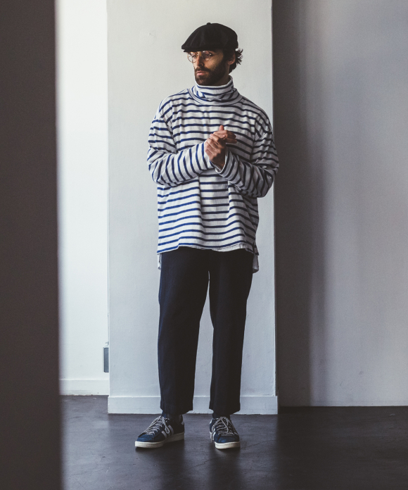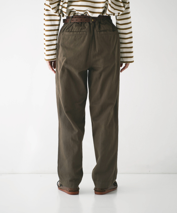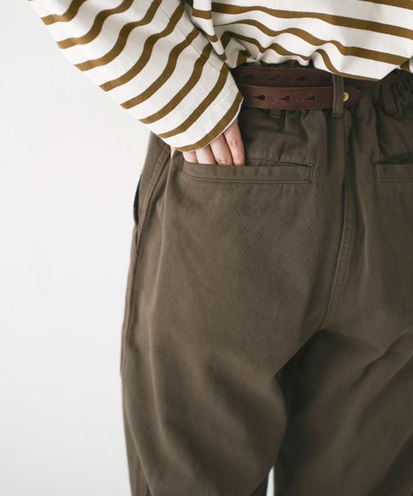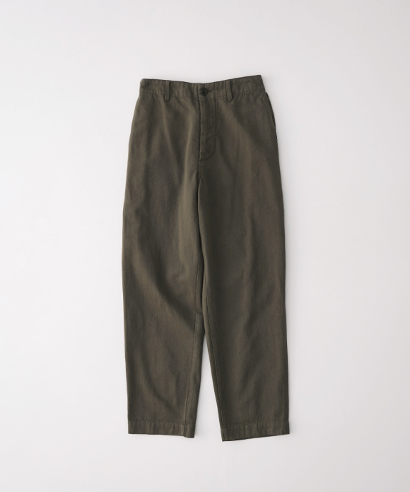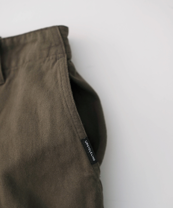 A tapered pants, meticulously crafted from our exclusive, seasonless UpcycleLino chino fabric. This eco-friendly and sustainable chino fabric is the result of a collaboration with a traditional fabric house in Okayama, Japan. The innovative material is knitted using a unique combination of heavier weight undyed cotton warp yarn and heavy weight undyed UpcycleLino weft yarn. UpcycleLino yarn is a blend of linen fabric remnants from our garment production and virgin cotton fibers, ensuring a reduced environmental impact while maintaining superior quality and comfort.