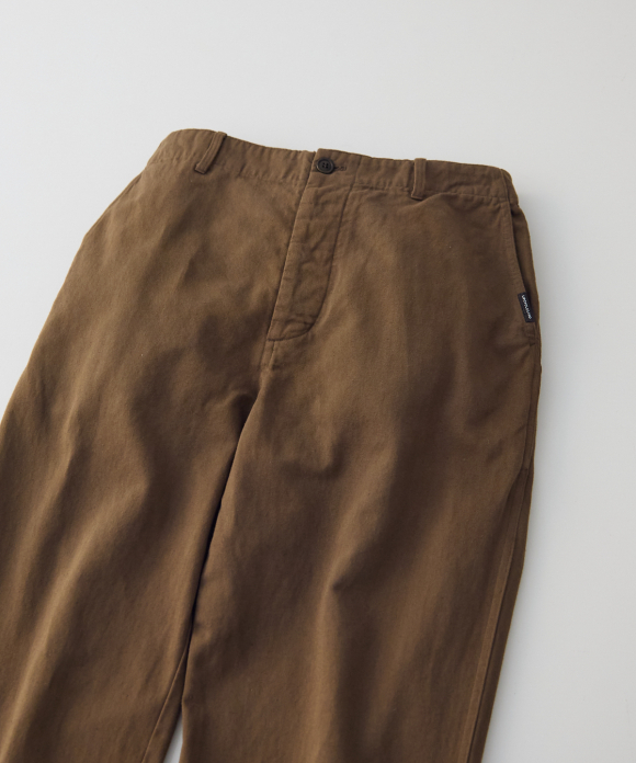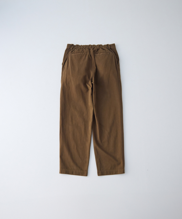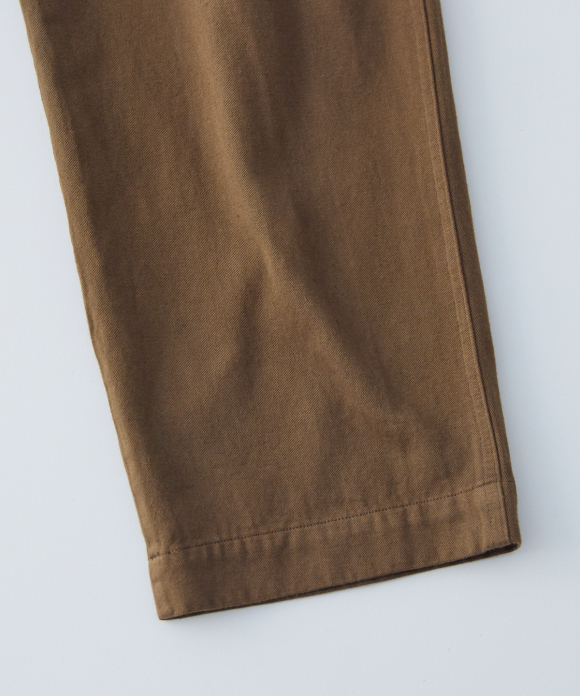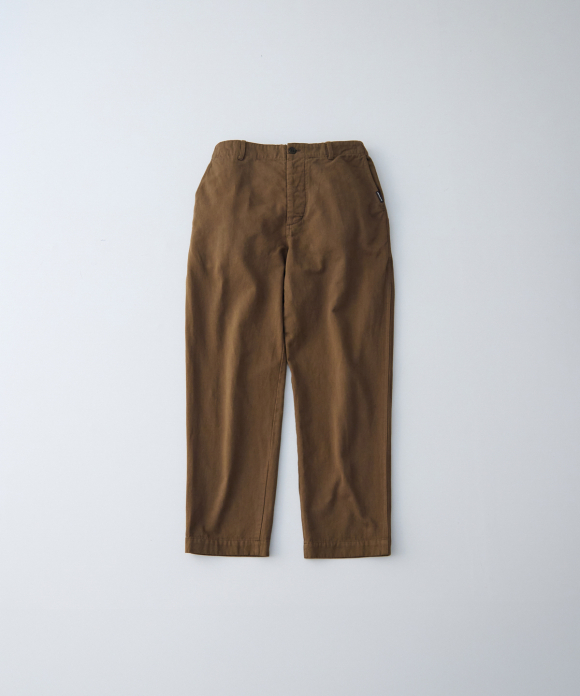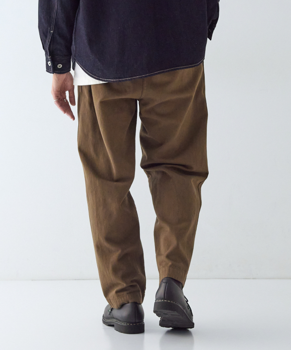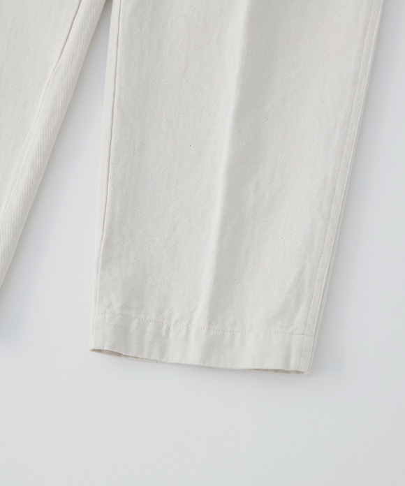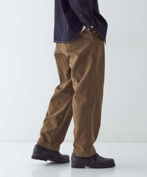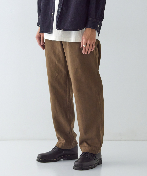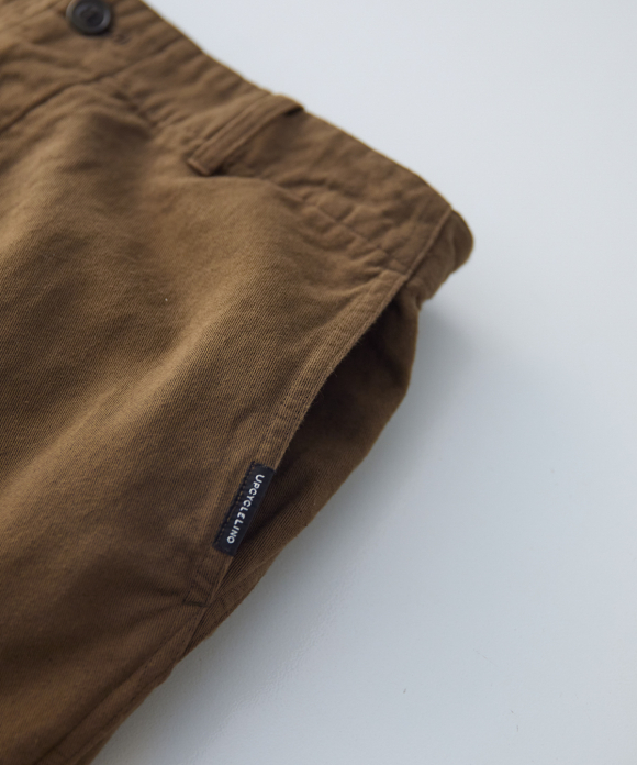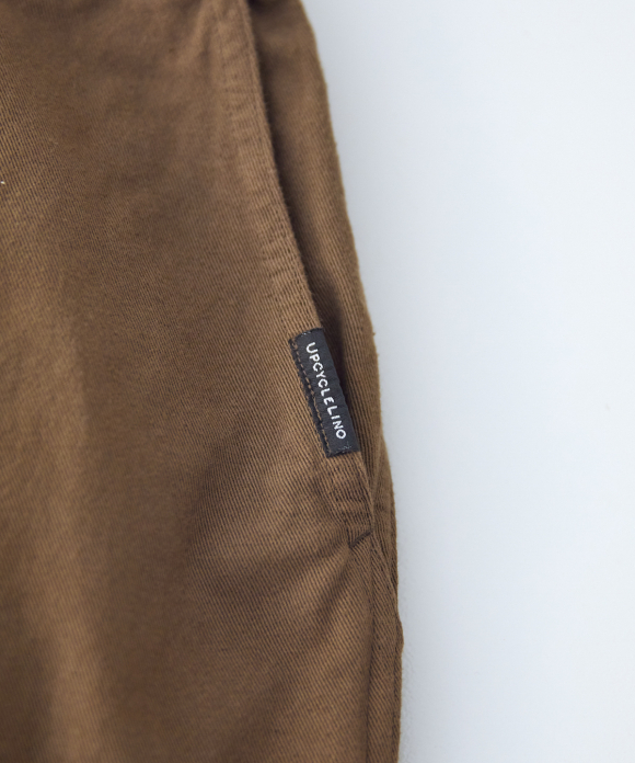 A tapered pants, meticulously crafted from our exclusive, seasonless UpcycleLino chino fabric. This eco-friendly and sustainable chino fabric is the result of a collaboration with a traditional fabric house in Okayama, Japan. The innovative material is knitted using a unique combination of heavier weight undyed cotton warp yarn and heavy weight undyed UpcycleLino weft yarn. UpcycleLino yarn is a blend of linen fabric remnants from our garment production and virgin cotton fibers, ensuring a reduced environmental impact while maintaining superior quality and comfort.