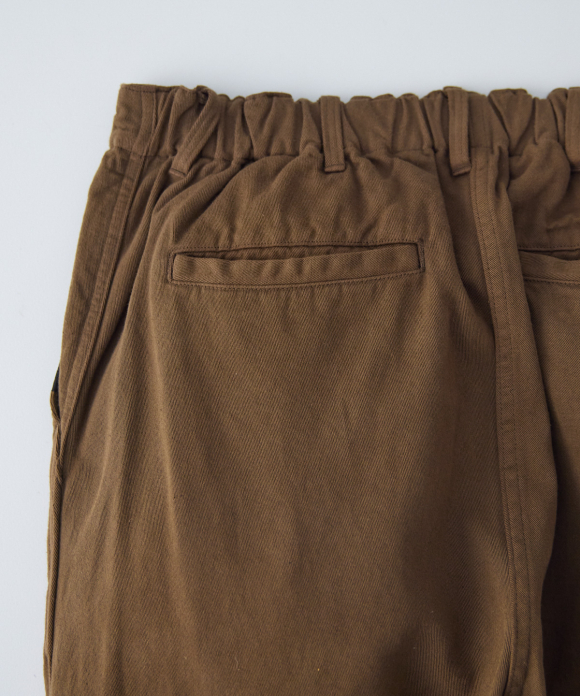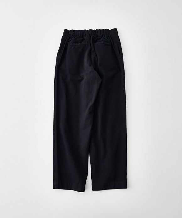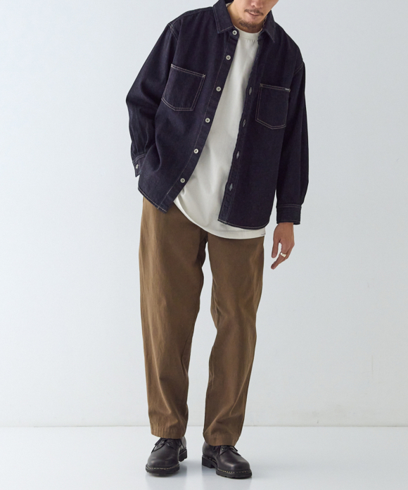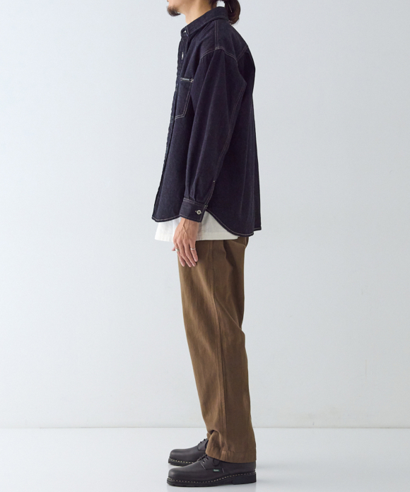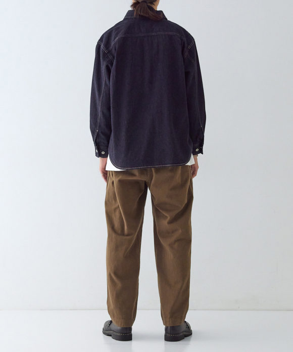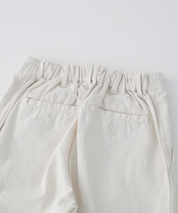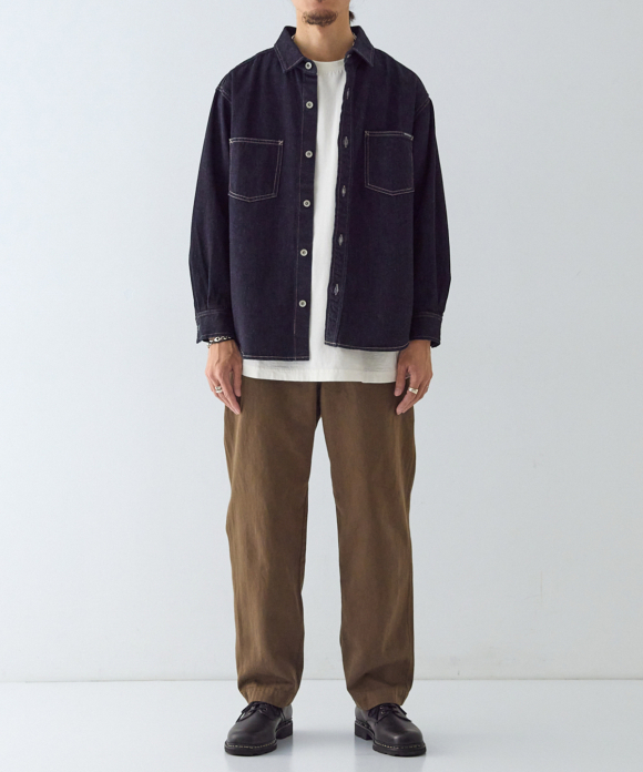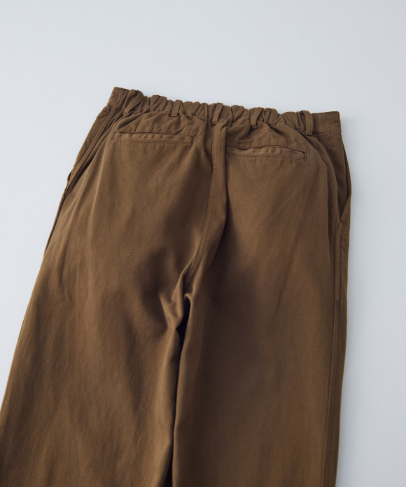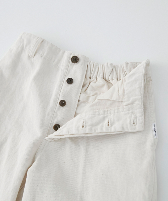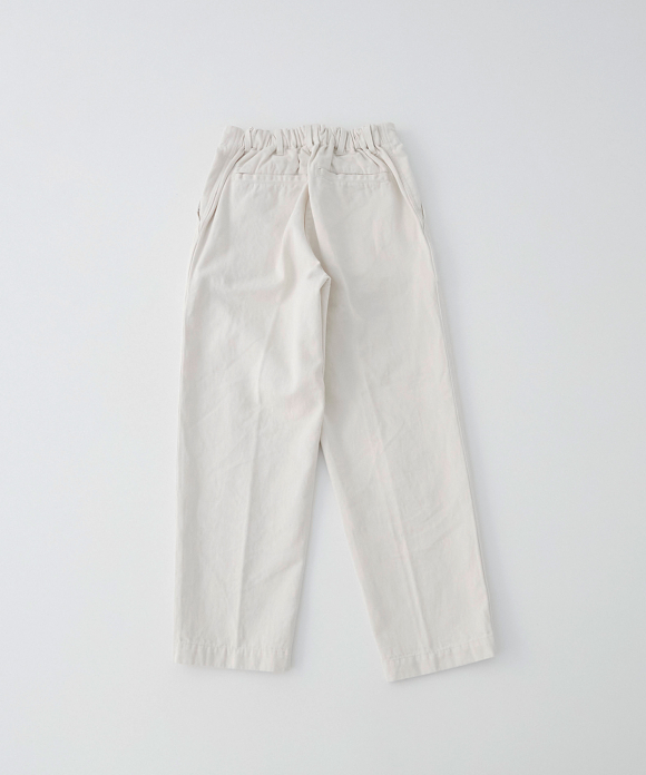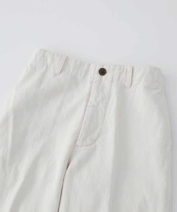 A tapered pants, meticulously crafted from our exclusive, seasonless UpcycleLino chino fabric. This eco-friendly and sustainable chino fabric is the result of a collaboration with a traditional fabric house in Okayama, Japan. The innovative material is knitted using a unique combination of heavier weight undyed cotton warp yarn and heavy weight undyed UpcycleLino weft yarn. UpcycleLino yarn is a blend of linen fabric remnants from our garment production and virgin cotton fibers, ensuring a reduced environmental impact while maintaining superior quality and comfort.