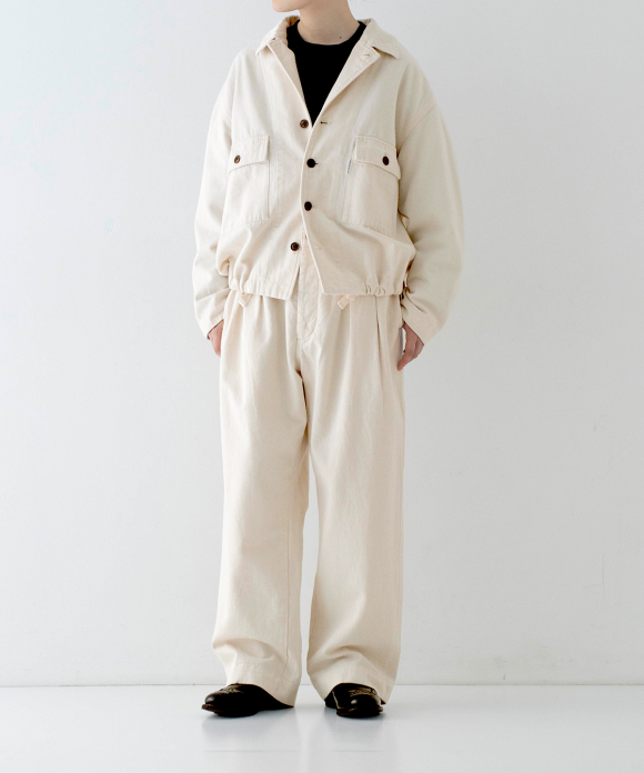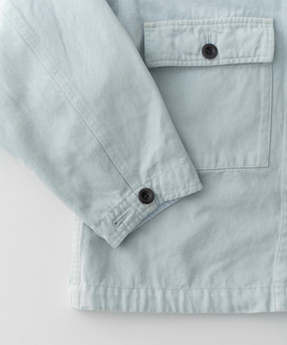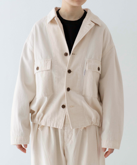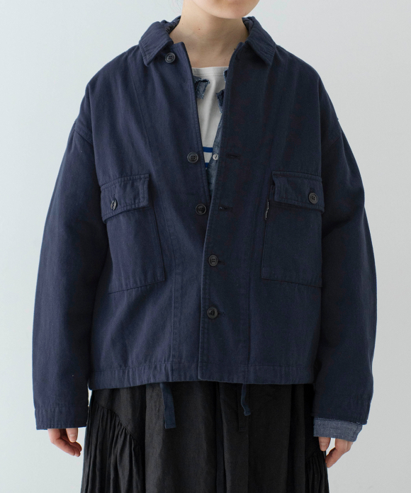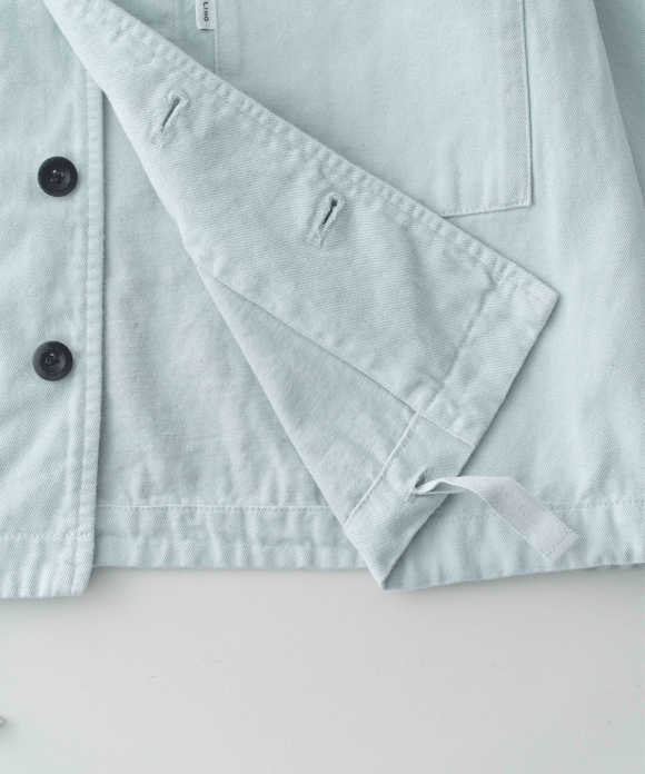 A field jacket, inspired by vintage military aesthetic and crafted from our exclusive, seasonless UpcycleLino chino fabric. This piece takes its design cues from the iconic U.S. Army M43 jacket, popularized during the 1940s and 1950s. The eco-friendly and sustainable UpcycleLino chino fabric is a unique collaboration with an established fabric house in Okayama, Japan. It is knitted from a combination of heavy weight undyed cotton warp yarn and heavy weight undyed UpcycleLino weft yarn. UpcycleLino yarn is crafted from a blend of linen fabric remnants from our garment production and virgin cotton fibers, resulting in a material that is both environmentally conscious and of superior quality.