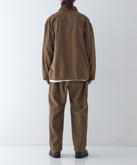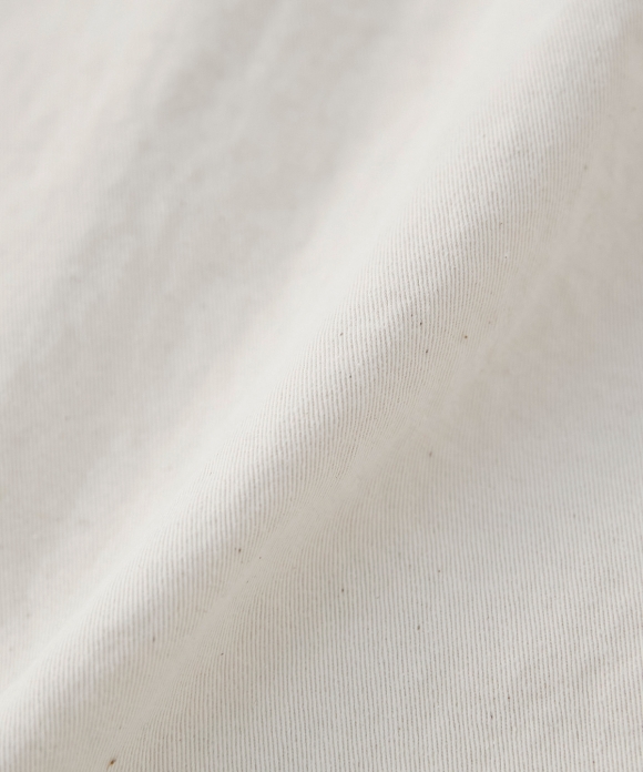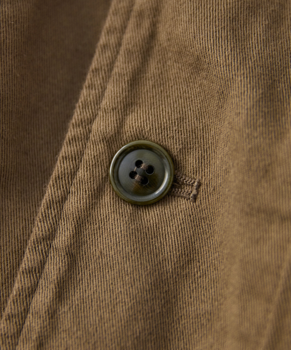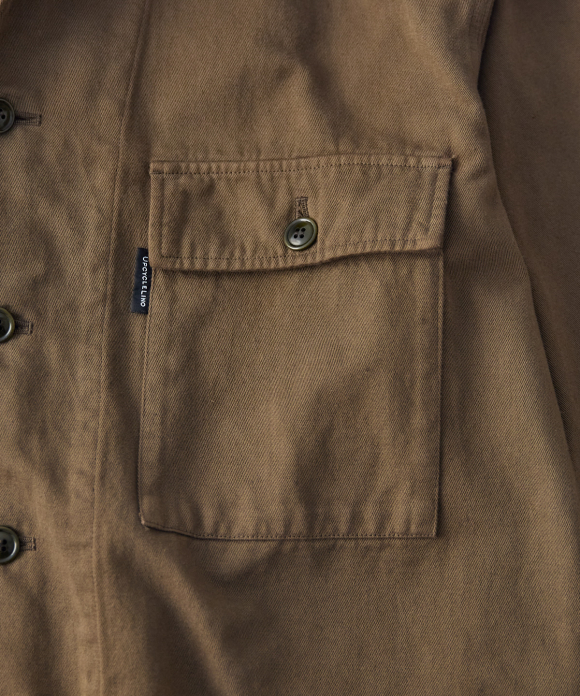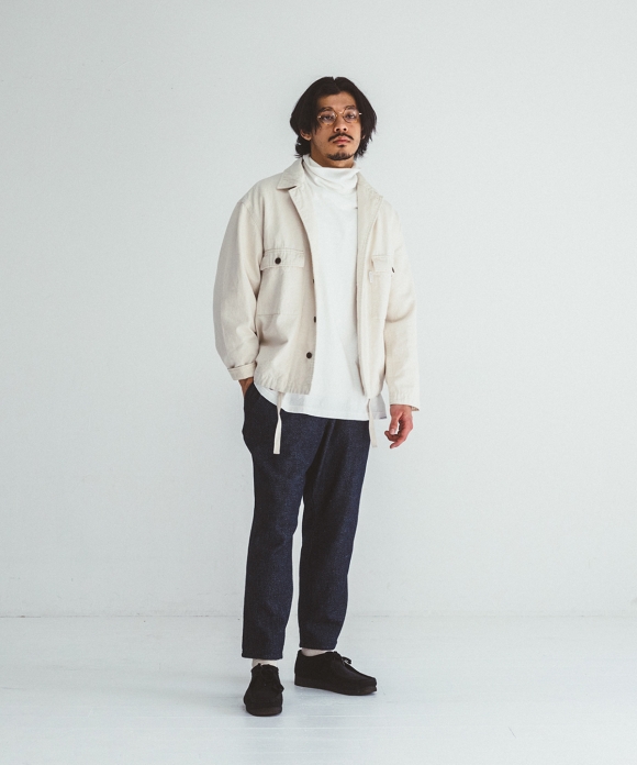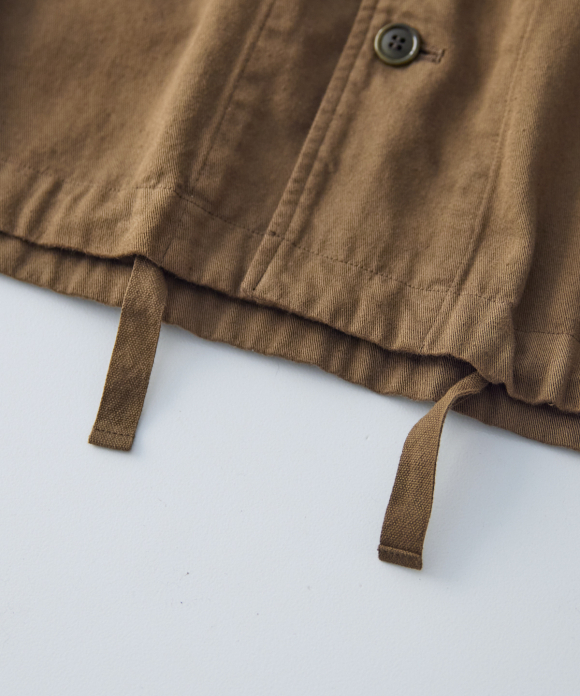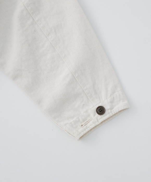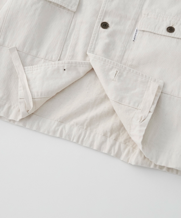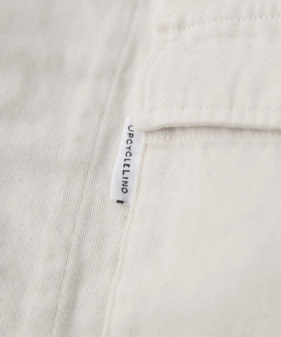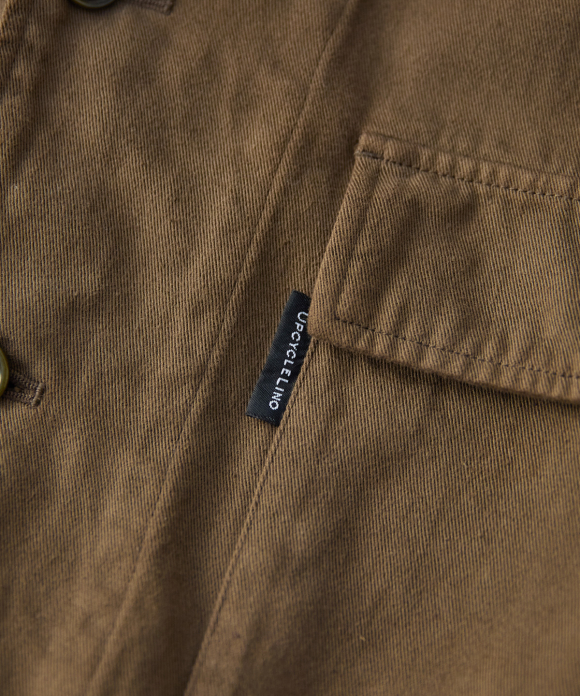 A field jacket, inspired by vintage military aesthetic and crafted from our exclusive, seasonless UpcycleLino chino fabric. This piece takes its design cues from the iconic U.S. Army M43 jacket, popularized during the 1940s and 1950s. The eco-friendly and sustainable UpcycleLino chino fabric is a unique collaboration with an established fabric house in Okayama, Japan. It is knitted from a combination of heavy weight undyed cotton warp yarn and heavy weight undyed UpcycleLino weft yarn. UpcycleLino yarn is crafted from a blend of linen fabric remnants from our garment production and virgin cotton fibers, resulting in a material that is both environmentally conscious and of superior quality.