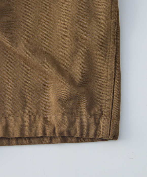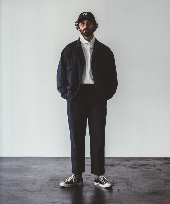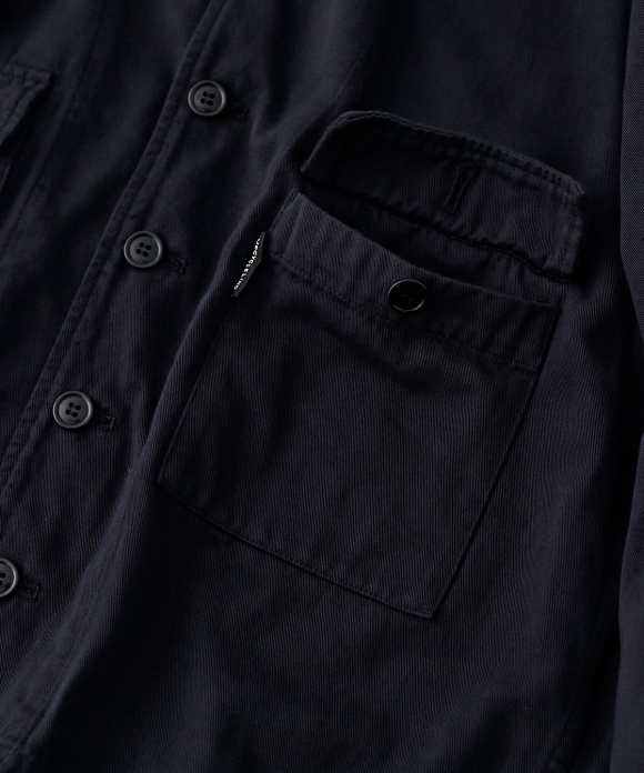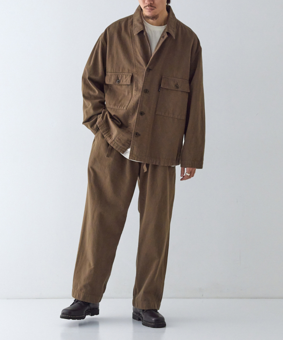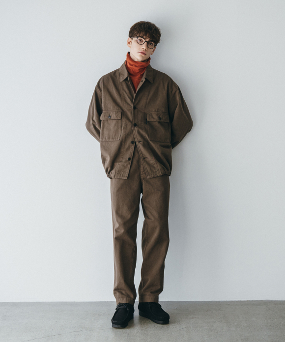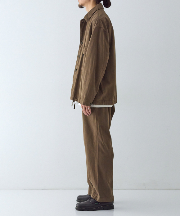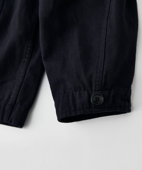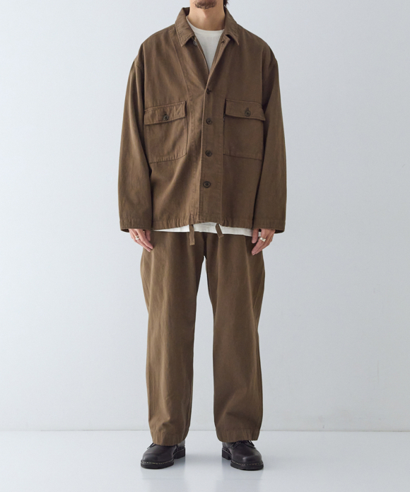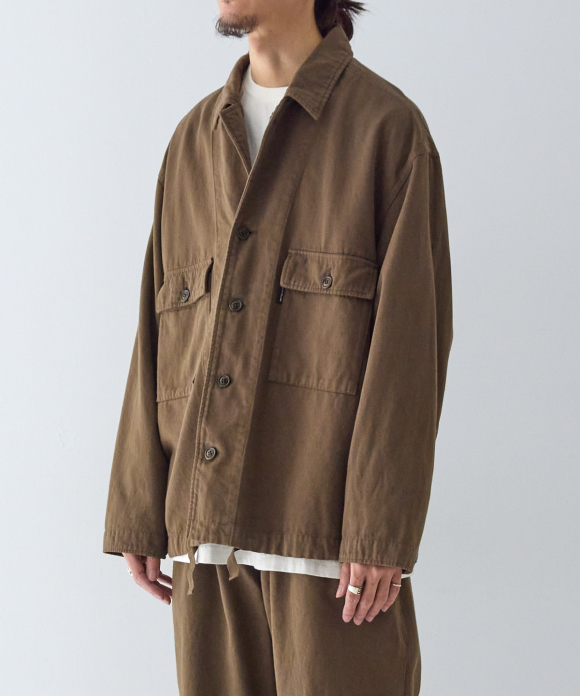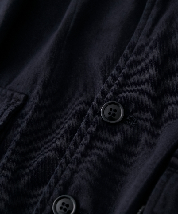 A field jacket, inspired by vintage military aesthetic and crafted from our exclusive, seasonless UpcycleLino chino fabric. This piece takes its design cues from the iconic U.S. Army M43 jacket, popularized during the 1940s and 1950s. The eco-friendly and sustainable UpcycleLino chino fabric is a unique collaboration with an established fabric house in Okayama, Japan. It is knitted from a combination of heavy weight undyed cotton warp yarn and heavy weight undyed UpcycleLino weft yarn. UpcycleLino yarn is crafted from a blend of linen fabric remnants from our garment production and virgin cotton fibers, resulting in a material that is both environmentally conscious and of superior quality.