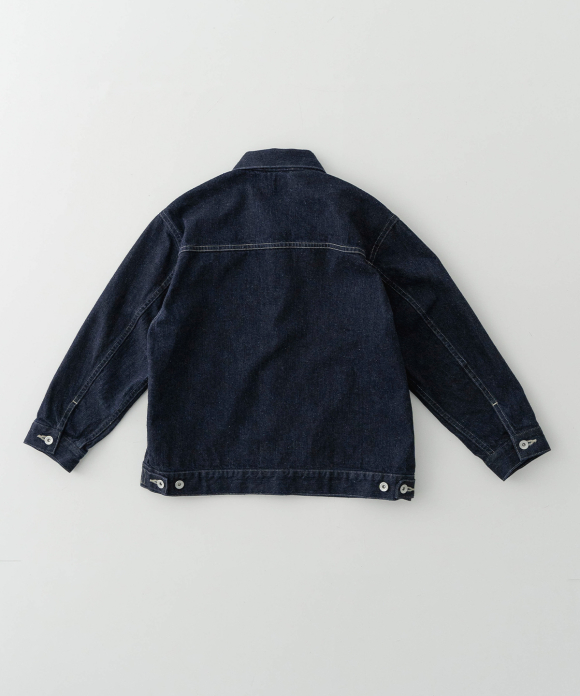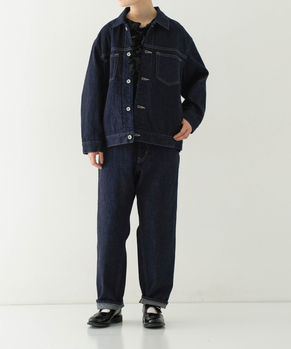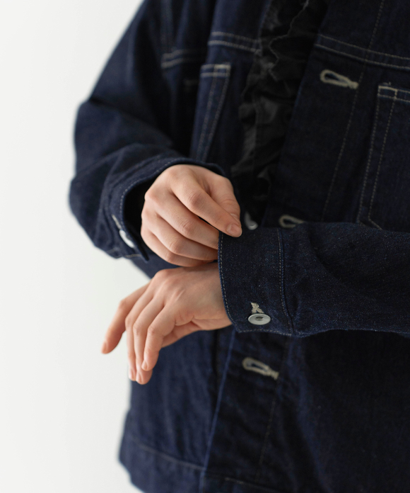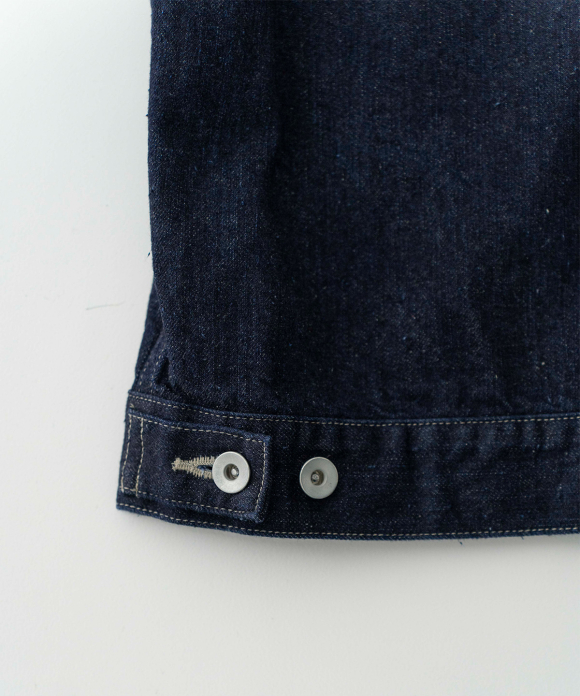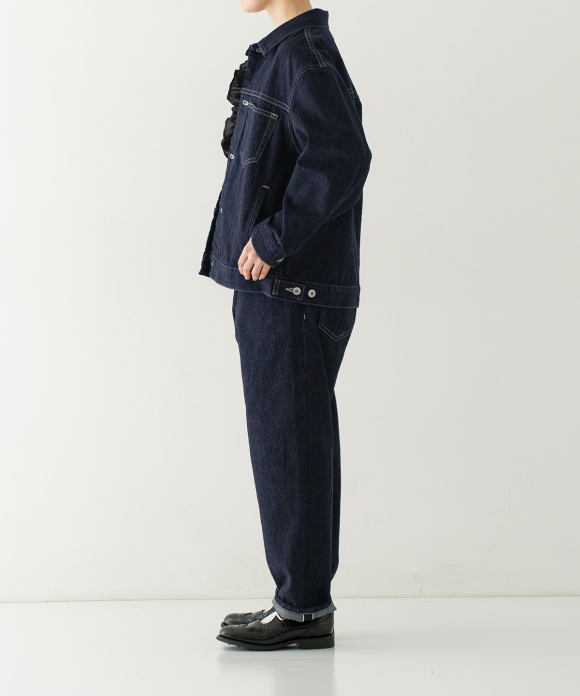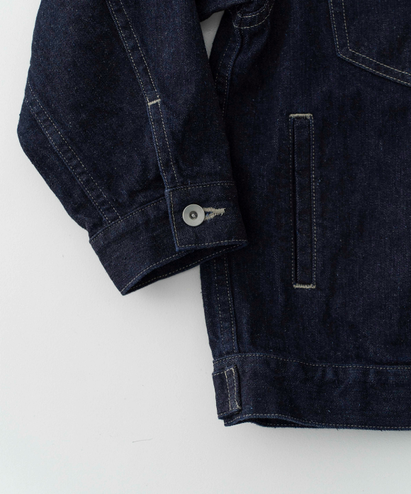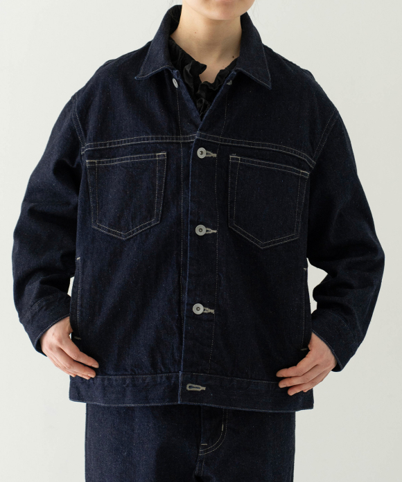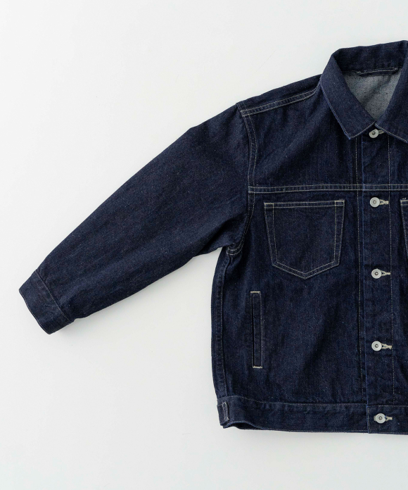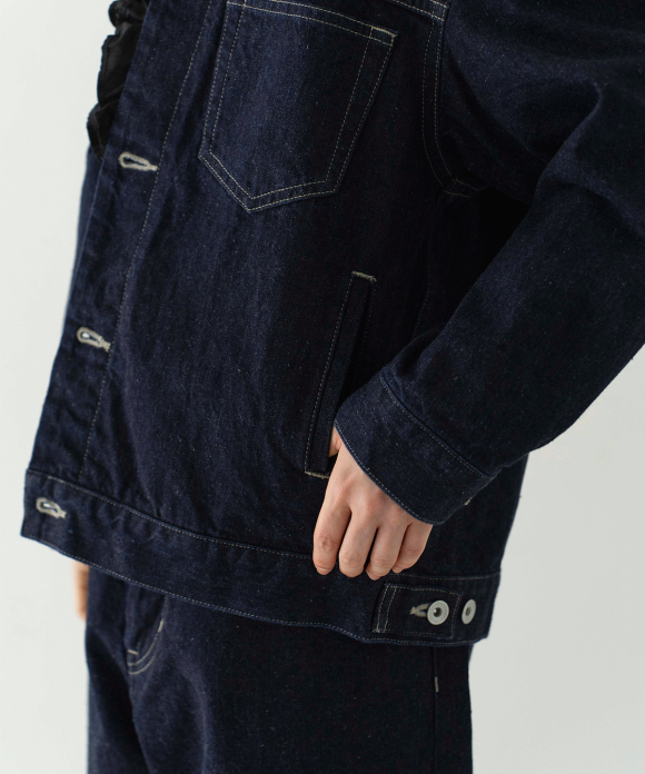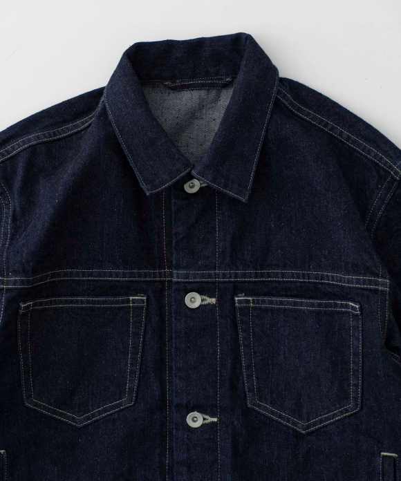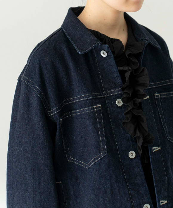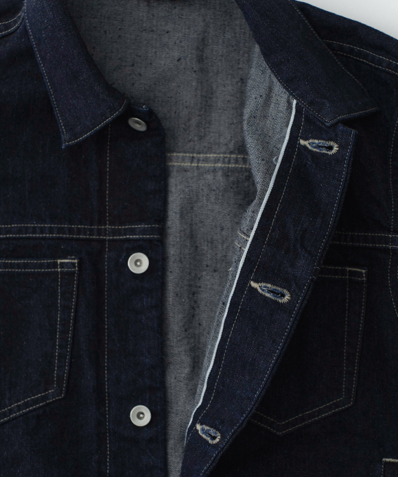 A jacket made from a crisp selvedge denim fabric. The selvedge of the fabric is used for the facing of the placket. Flat pockets on both chests give it a clean look.