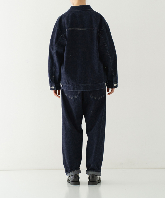 We created a denim fabric using warp threads that are sustainable, featuring natural neps created by spinning together parts that would normally be discarded during the yarn production stage. (The weft threads are recycled linen.) The weaving and finishing processes were done in Okayama, and the dyeing was done in the Bingo region of Hiroshima. The fabric was woven using old-fashioned looms, at a slower speed than modern looms, resulting in a unique texture and uneven weave, creating a soft fabric. It offers comfortable wear from the first time you put it on, and the fabric becomes even softer and more comfortable with wear, allowing you to enjoy the changes in texture over time. This is a Made-in-Japan fabric, with dyeing, weaving, and finishing all done in Japan.