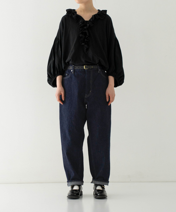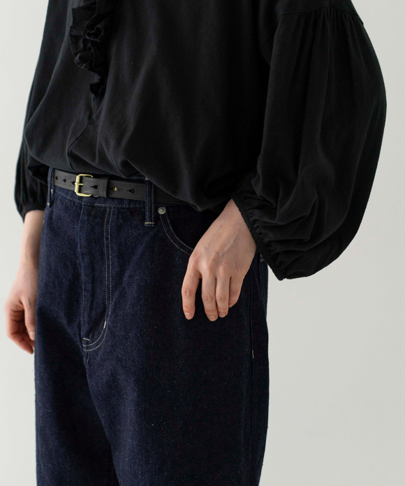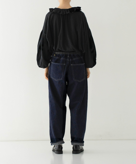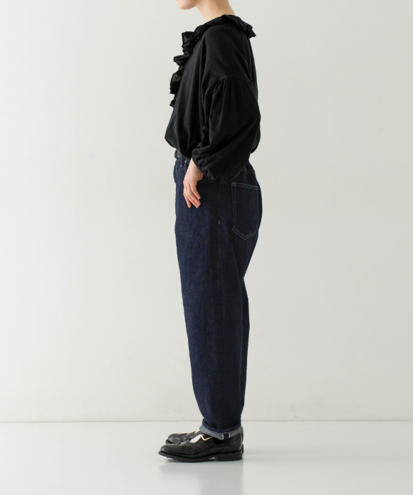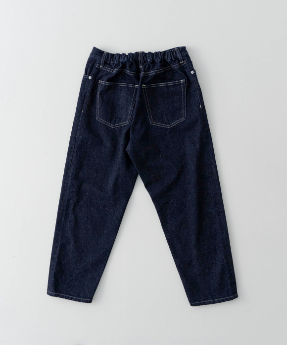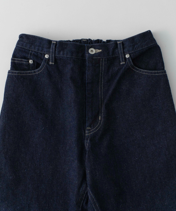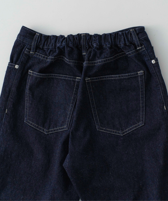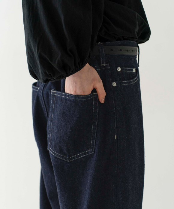 We created a denim fabric using warp threads that are sustainable, featuring natural neps created by spinning together parts that would normally be discarded during the yarn production stage. (The weft threads are recycled linen.) The weaving and finishing processes were done in Okayama, and the dyeing was done in the Bingo region of Hiroshima. The fabric was woven using old-fashioned looms, at a slower speed than modern looms, resulting in a unique texture and uneven weave, creating a soft fabric. It offers comfortable wear from the first time you put it on, and the fabric becomes even softer and more comfortable with wear, allowing you to enjoy the changes in texture over time. This is a Made-in-Japan fabric, with dyeing, weaving, and finishing all done in Japan.