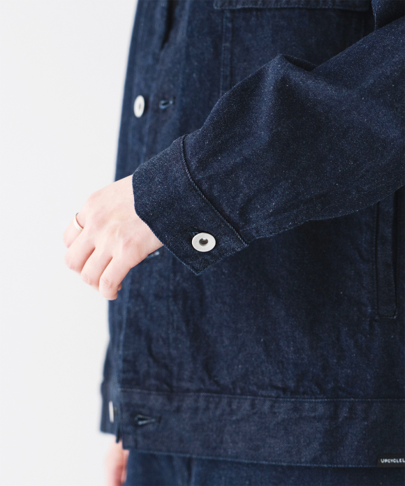 Color of this fabric comes out more settled and nuanced deep navy than the traditional navy color of denim. It also has slightly rough and nubby texture as those of the vintage clothing due to our upcycled yarn used to make this fabric.