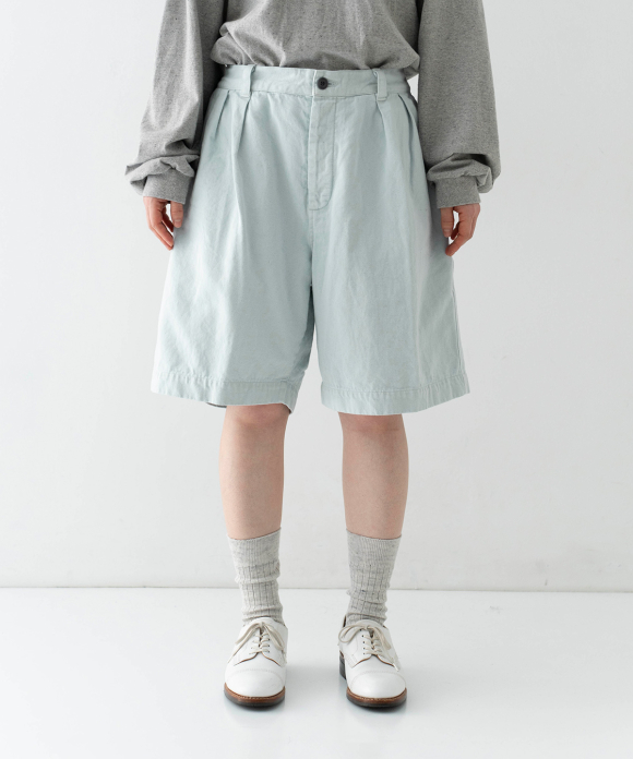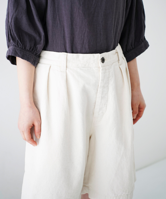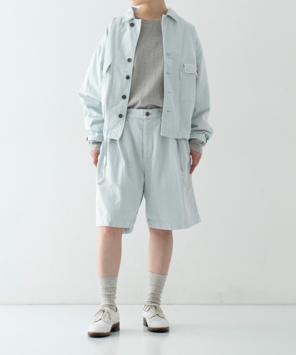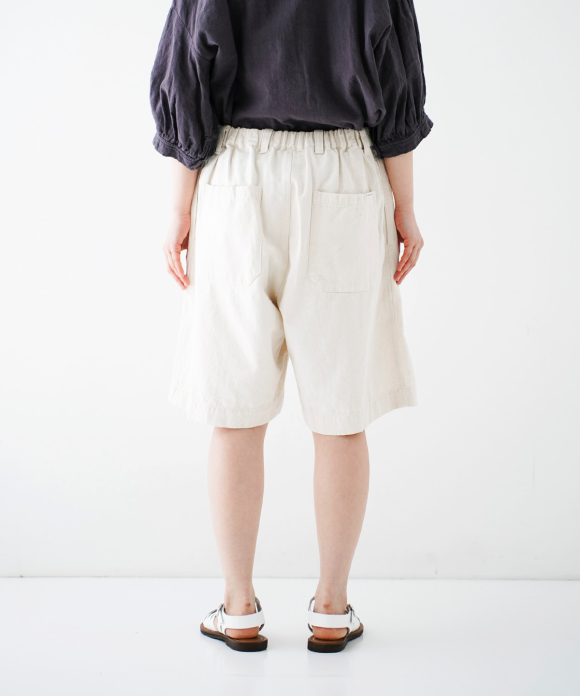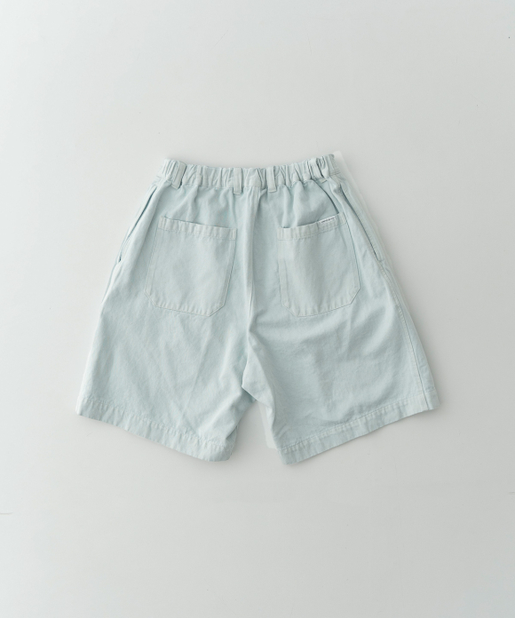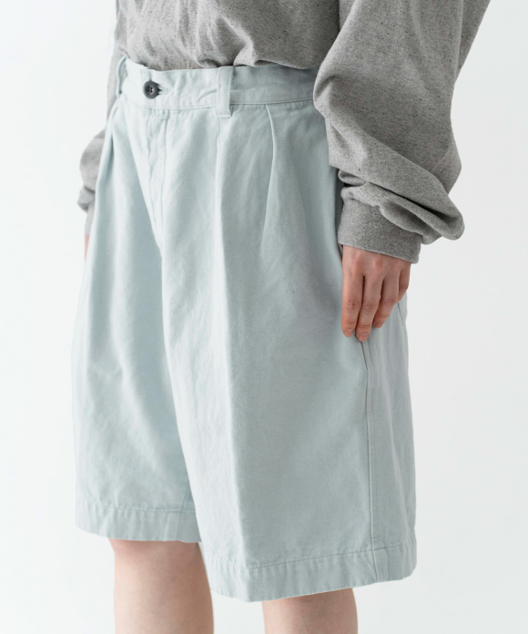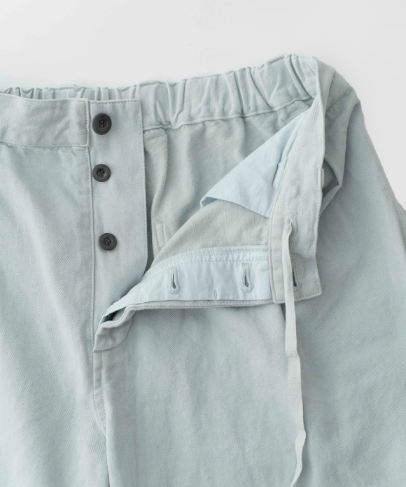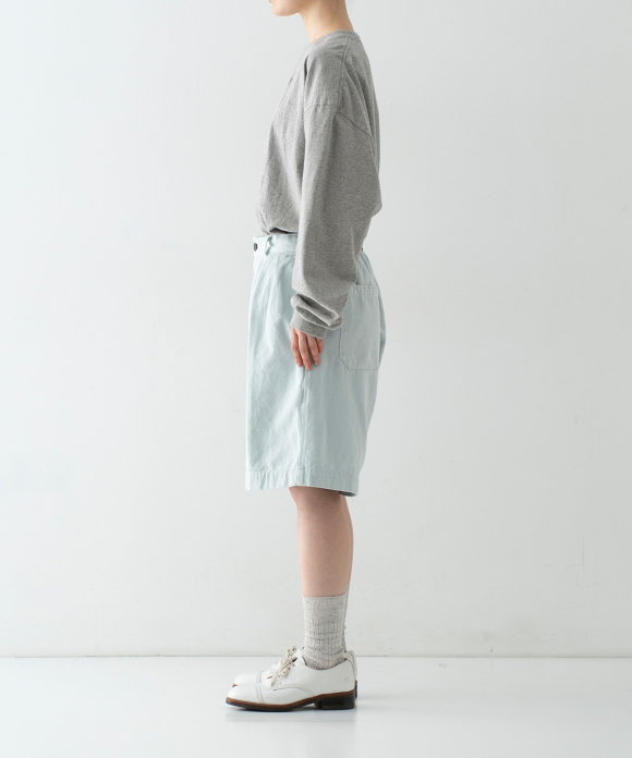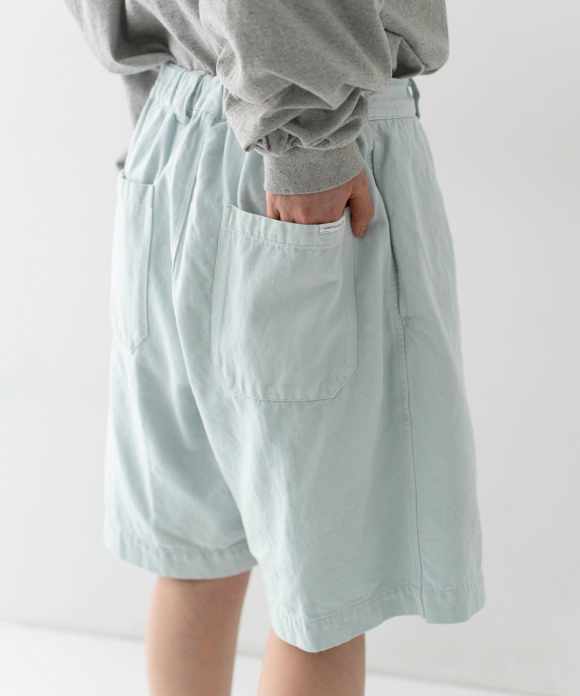 These denim shorts feature a baggy silhouette with two pleats at the front and a straight flare towards the hem. The rise is set high, and the waist position can be adjusted to control the knee position. The elastic back gathers enhance the fit without interfering with the front silhouette, and the waist can be secured with a drawstring and belt loops. You can freely use them to create different styles, such as when tucking in your top. The back features large patch pockets with rounded corners, inspired by workwear. While maintaining the same shape as the previous denim shorts, the stitching is the same color as the fabric, and the buttons have been changed from nut buttons to donut-type tuck buttons, creating a sense of unity as an item using the same fabric.