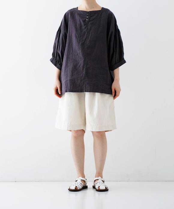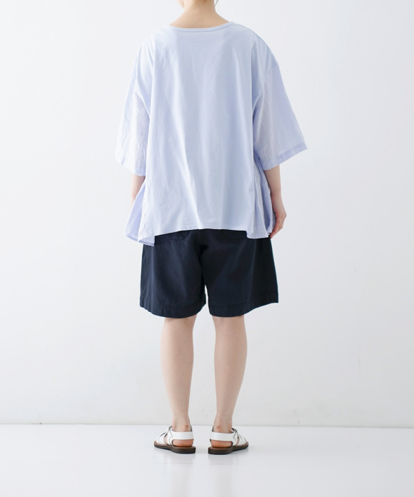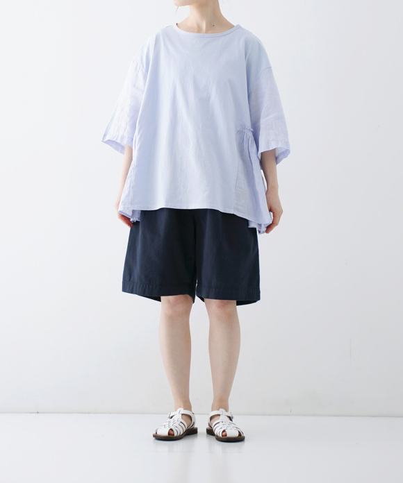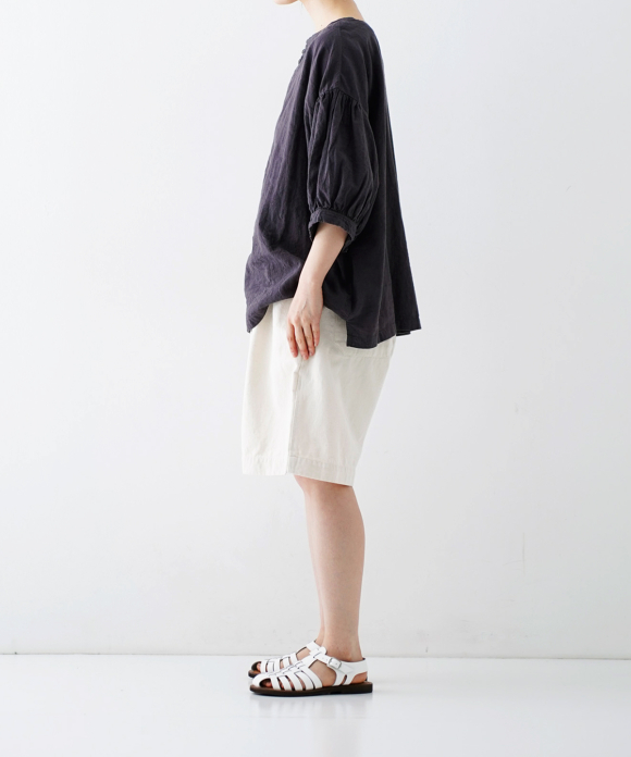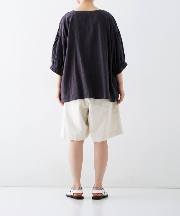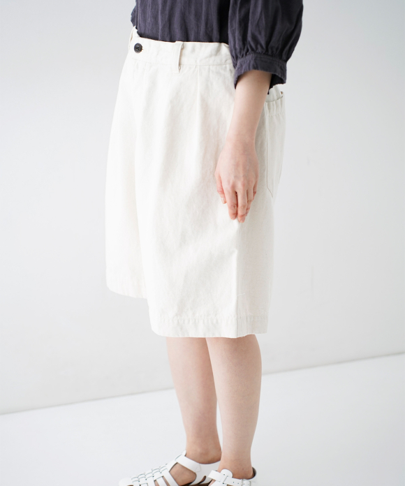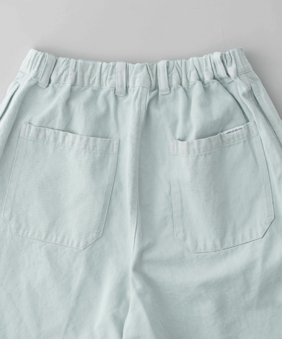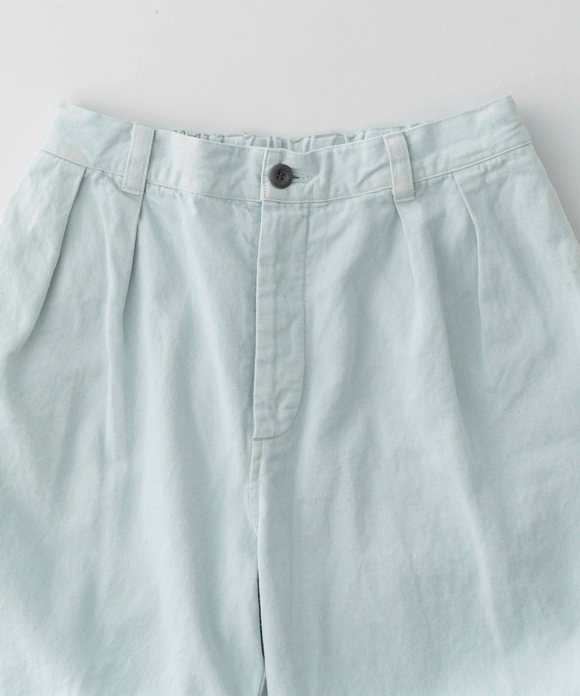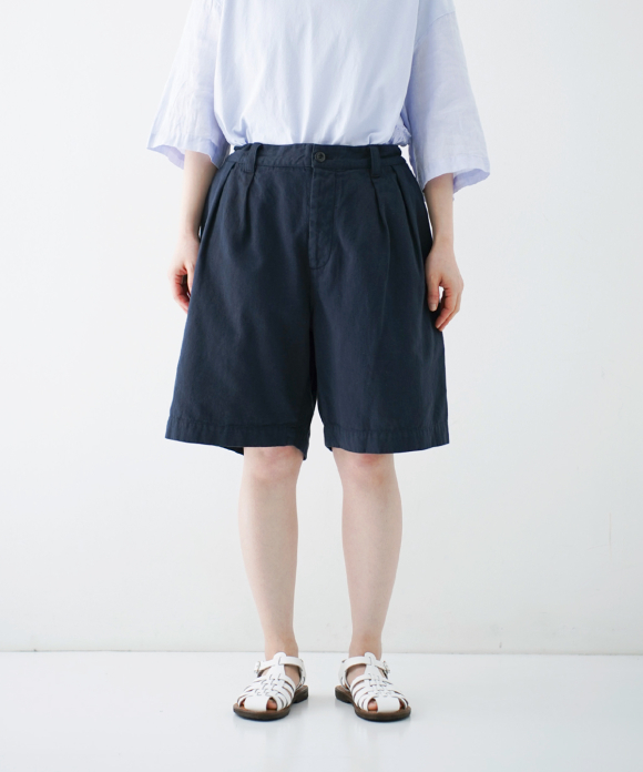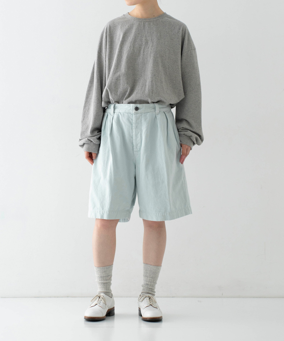 These denim shorts feature a baggy silhouette with two pleats at the front and a straight flare towards the hem. The rise is set high, and the waist position can be adjusted to control the knee position. The elastic back gathers enhance the fit without interfering with the front silhouette, and the waist can be secured with a drawstring and belt loops. You can freely use them to create different styles, such as when tucking in your top. The back features large patch pockets with rounded corners, inspired by workwear. While maintaining the same shape as the previous denim shorts, the stitching is the same color as the fabric, and the buttons have been changed from nut buttons to donut-type tuck buttons, creating a sense of unity as an item using the same fabric.